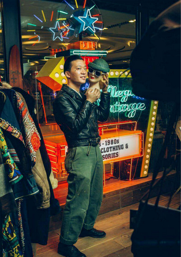 在北京古着圈,刘可“江湖”地位不可小觑,凭的是那间开了 8 年的店铺 Mega Vintage。油头、围裙、卷边牛仔裤,他和自家店员时常一身复古扮相。