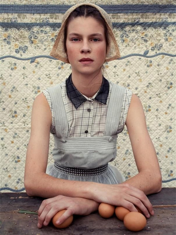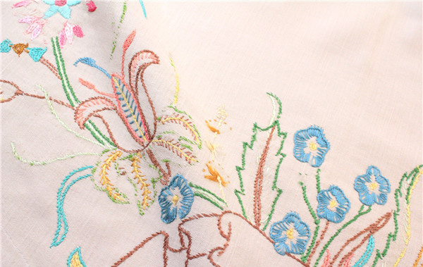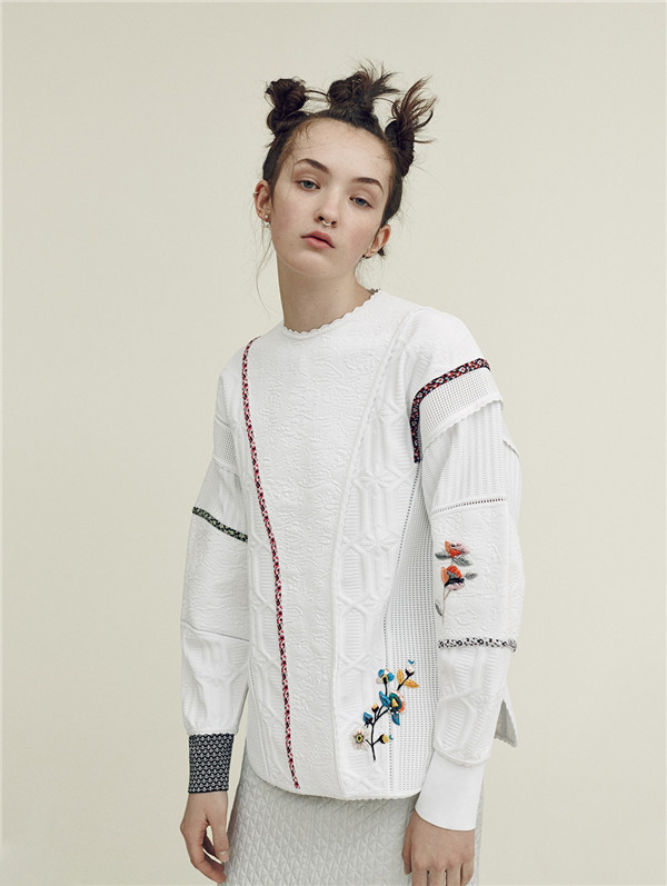 用于头巾或亚麻连衣裙、宽松上衣和夹克的刺绣图案,灵感源于传统的家庭餐桌布。采用清新淡雅的底色,如白色与淡褐色搭配样品式的十字绣、绸缎和绒线边缘图案。