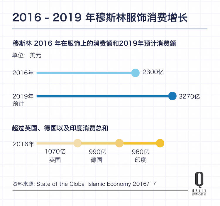根据《2015-2016年全球伊斯兰经济现状报告》(2015-2016 State of the Global Islamic Economy Report),穆斯林消费者2016年在服饰上的消费为2300亿美元。仅3年后,这个数字就将达到3270亿美元,超过英国(1070亿美元)、德国(990亿美元)以及印度(960亿美元)之和。