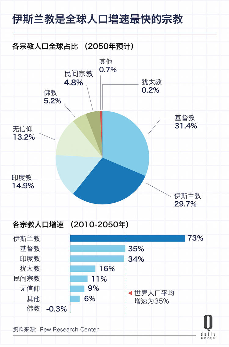 按照这种进度,伊斯兰教将在2070年赶超基督教,占到全球人口的32.3%,成为第一大宗教。