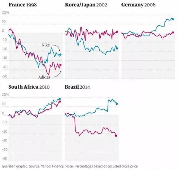 从过往的五届世界杯看,耐克在投资者眼中被认为是一个更好的选择。