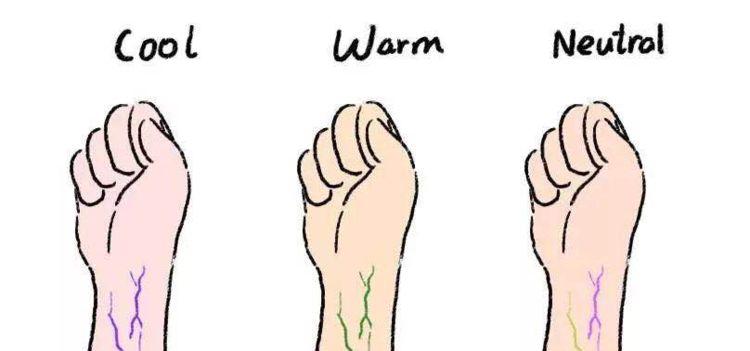 阳光下,观察手腕内侧的血管。如果偏绿偏绿色,那你就属于暖色系。偏蓝紫色,就属于冷色系。如果两种颜色都有,那么你就是不挑色的中性肤色,穿什么都好看!