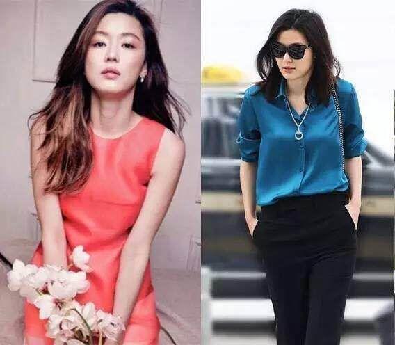 暖皮的全智贤,穿冷色系就显得老气。同样,暖色系妆容更适合她~