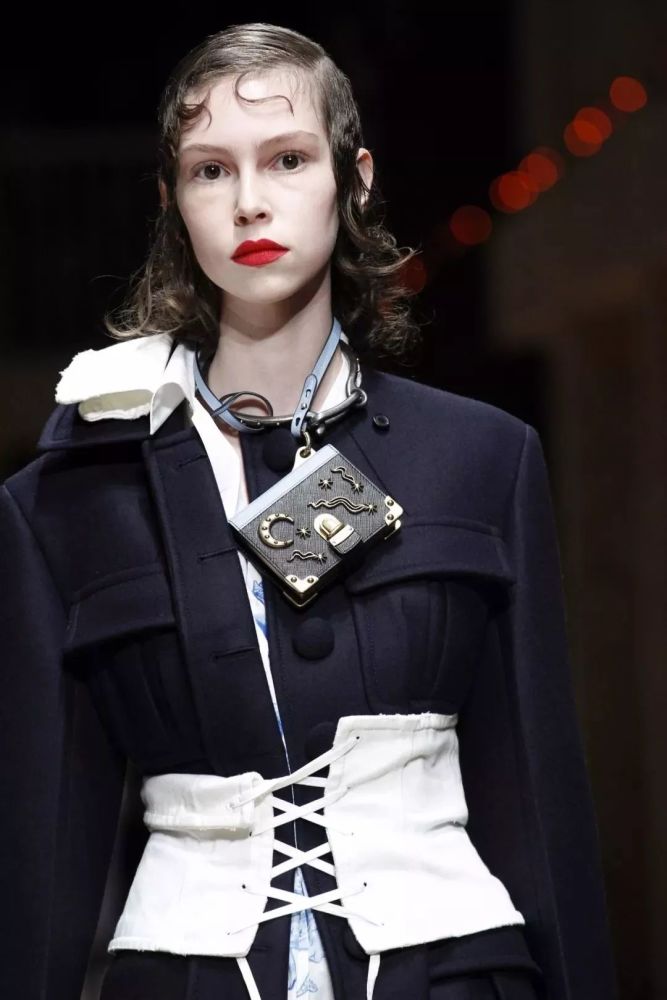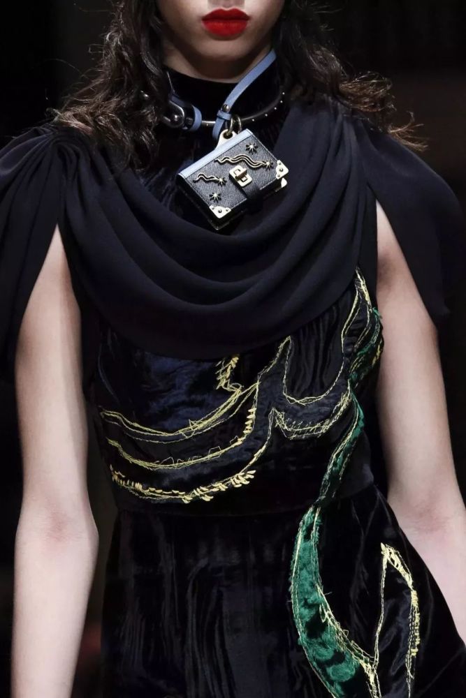 在2016的秋冬秀场上其实就出现了挂脖包的身影了,当时Prada的秀场上用皮带、项圈绕过颈肩穿过小包包,挂脖包更多地是作为一种装饰品而存在!