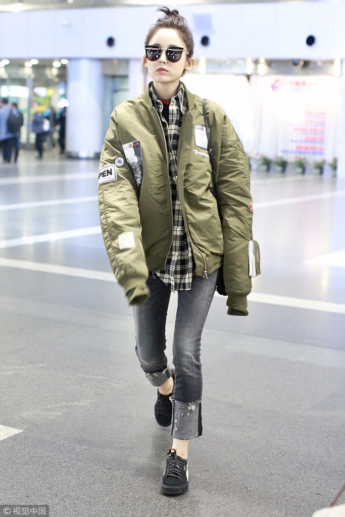 Alpha Industries飞行夹克开叉铅笔裤,配Chanel流浪包、Yeezy 700球鞋,也是十分的酷帅街头风~